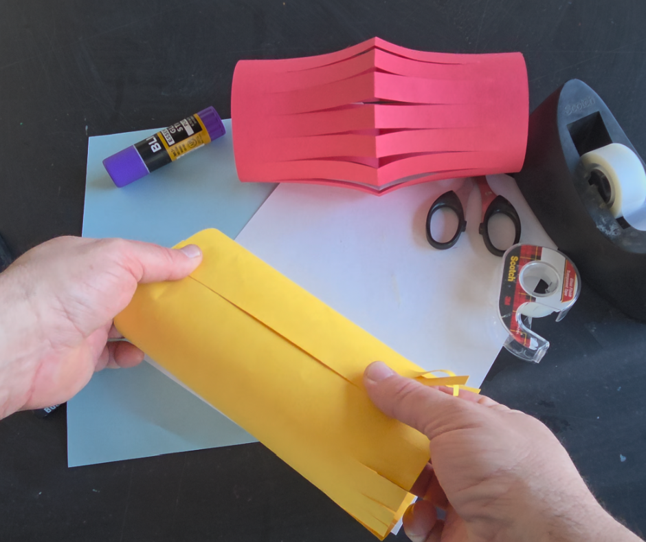 7. Add the Handle: Cut a strip of paper for the handle and fasten it to the top of the lantern.